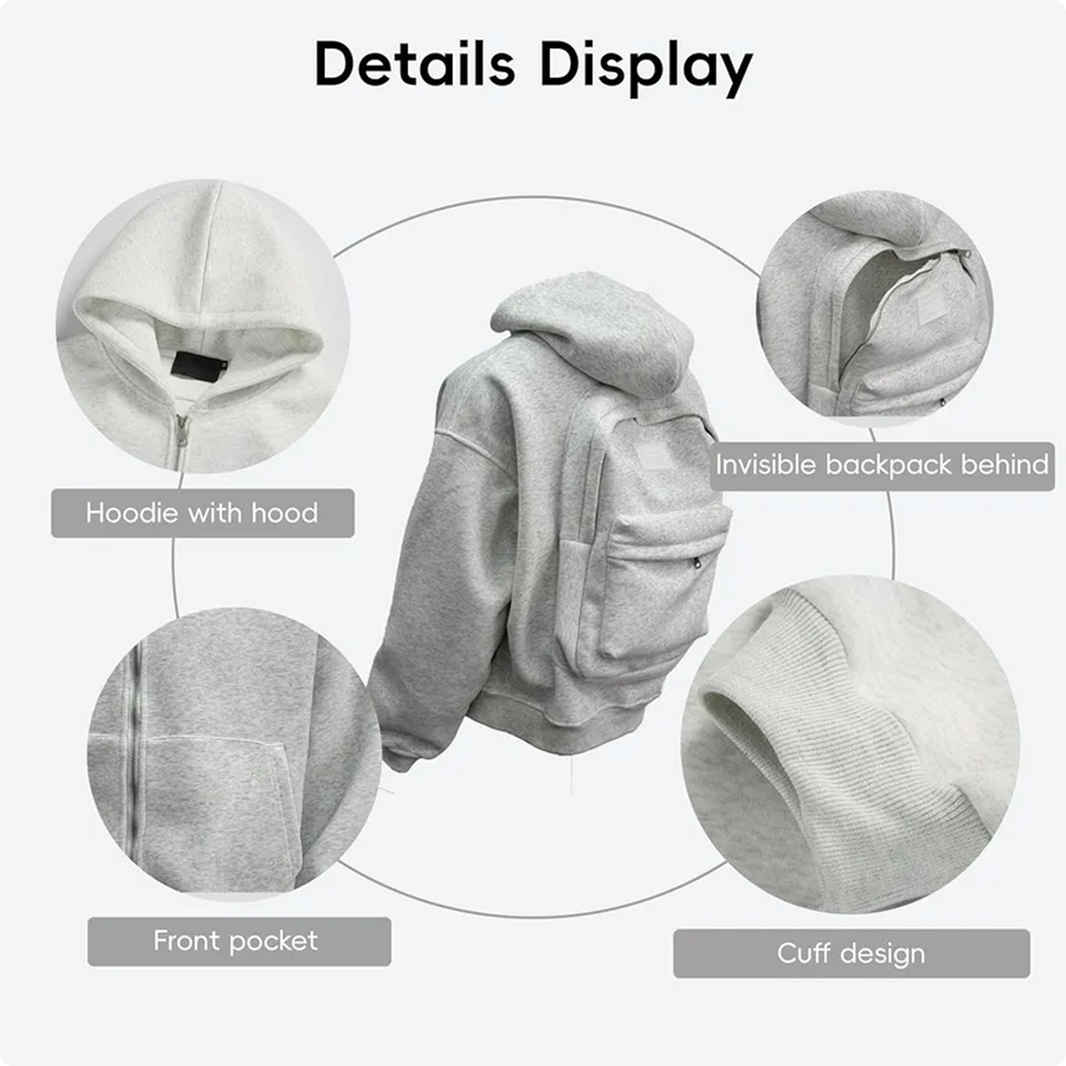 It combines a stylish hoodie with built-in backpack storage for hands-free convenience.